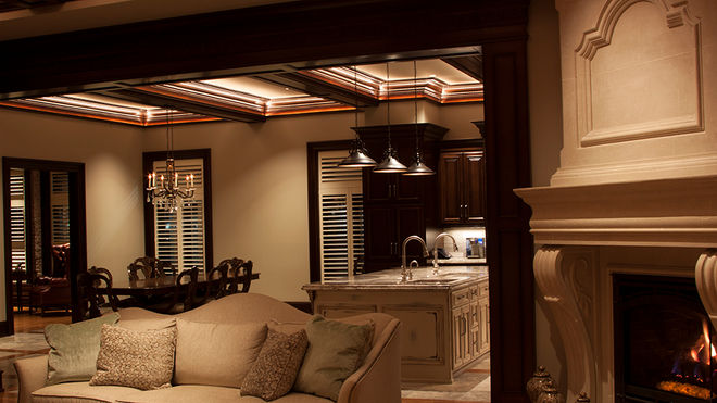 The challenge presented to me was to define specialty architectural features with light. The obvious choices to me were to accent with light were the coffered ceilings, fireplace mantel, kitchen island, cabinetry, and certain walls. This would be the art in their new home.